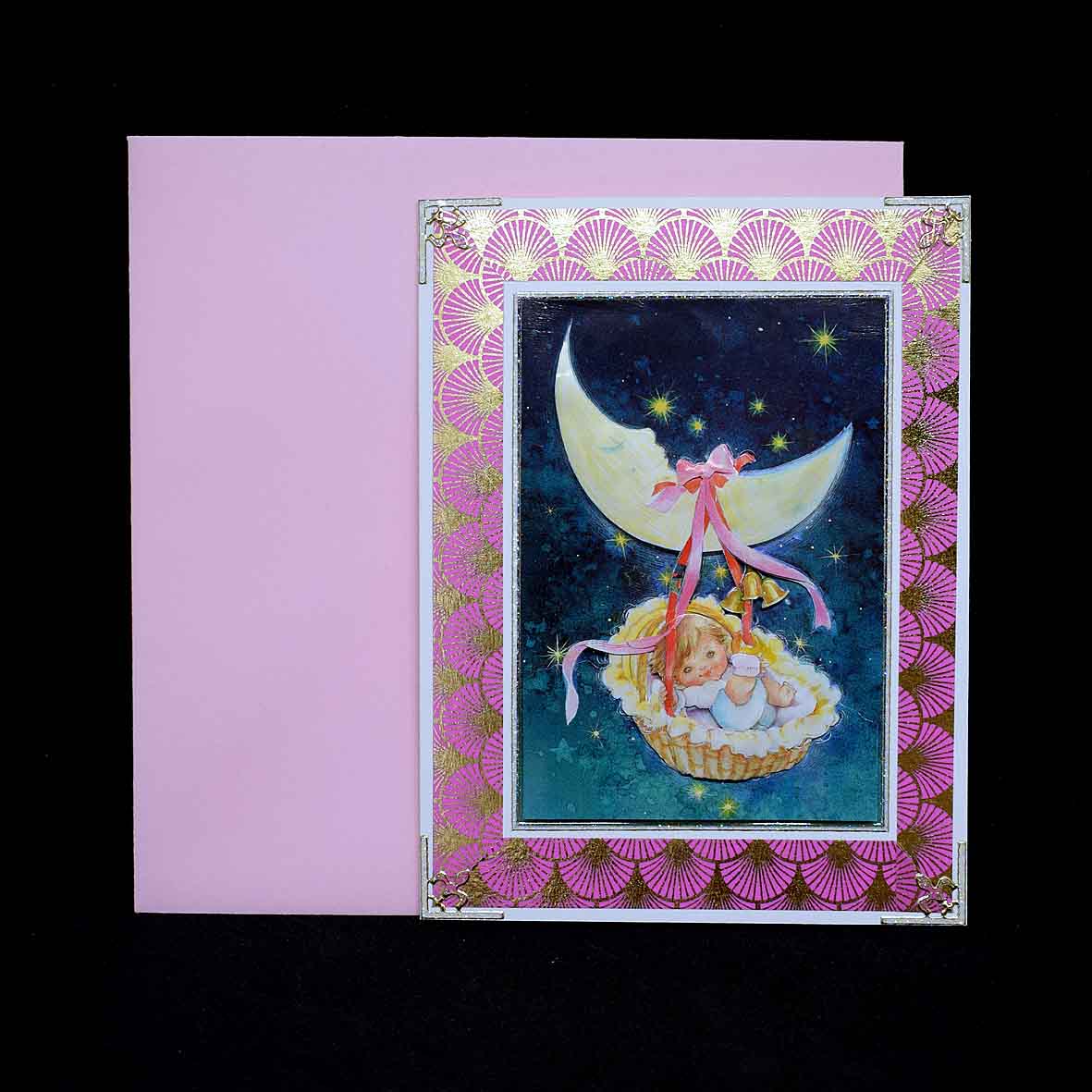 La carte est confectionnée en papier blanc irisé sans acide, délicatement décorée d'un ruban adhésif et d’un motif bébé en relief 3D, pour un rendu tendre et élégant.