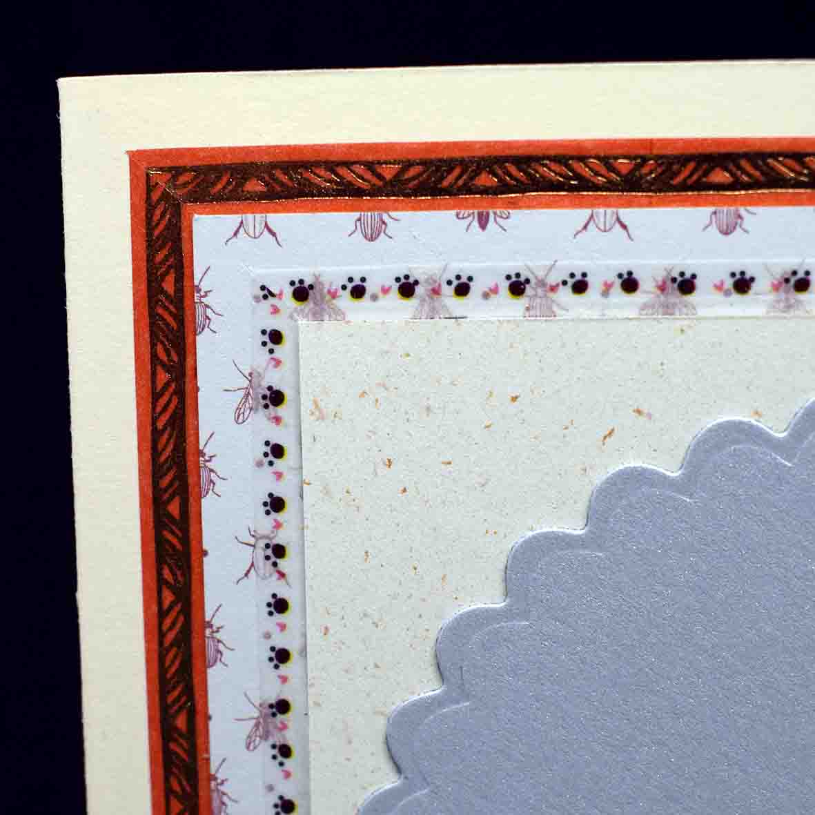 Carte pour diverses occasions comme un anniversaire, bonne année.......... en 3D, fait main, réalisée sur du papier ivoire, poussière de soleil irisé pailleté et blanc imprimé aux motifs d'insectes.