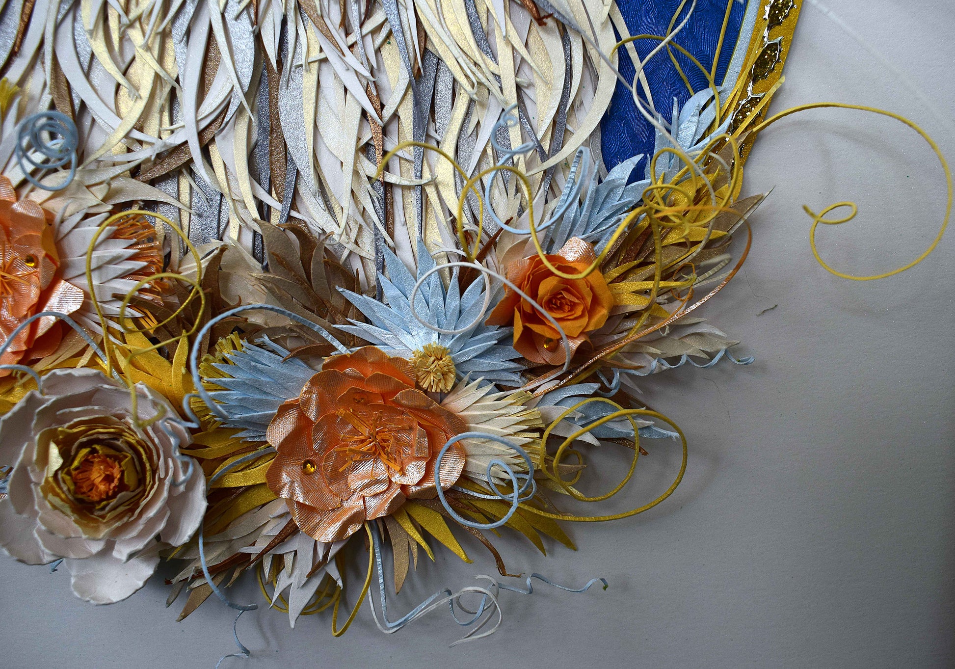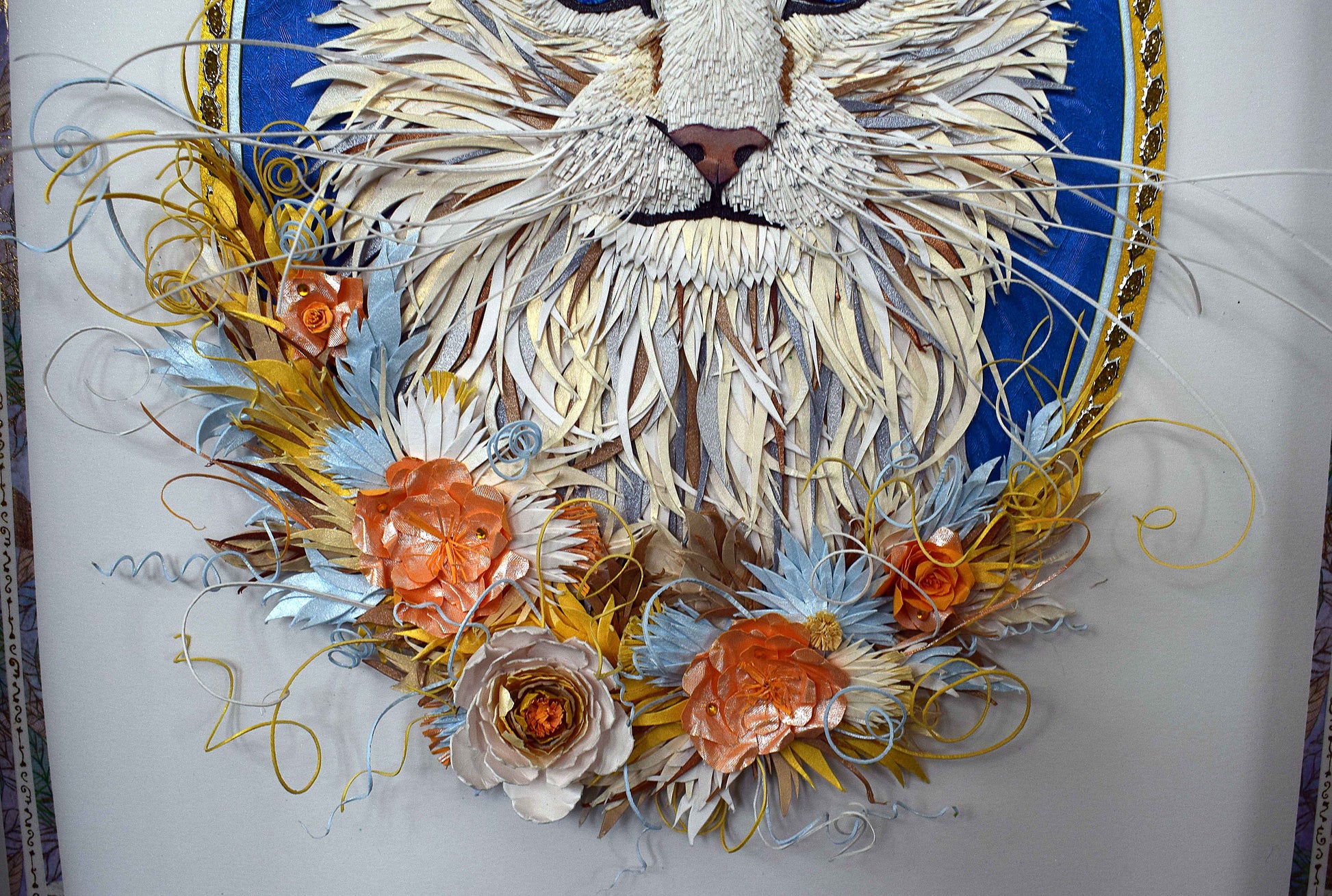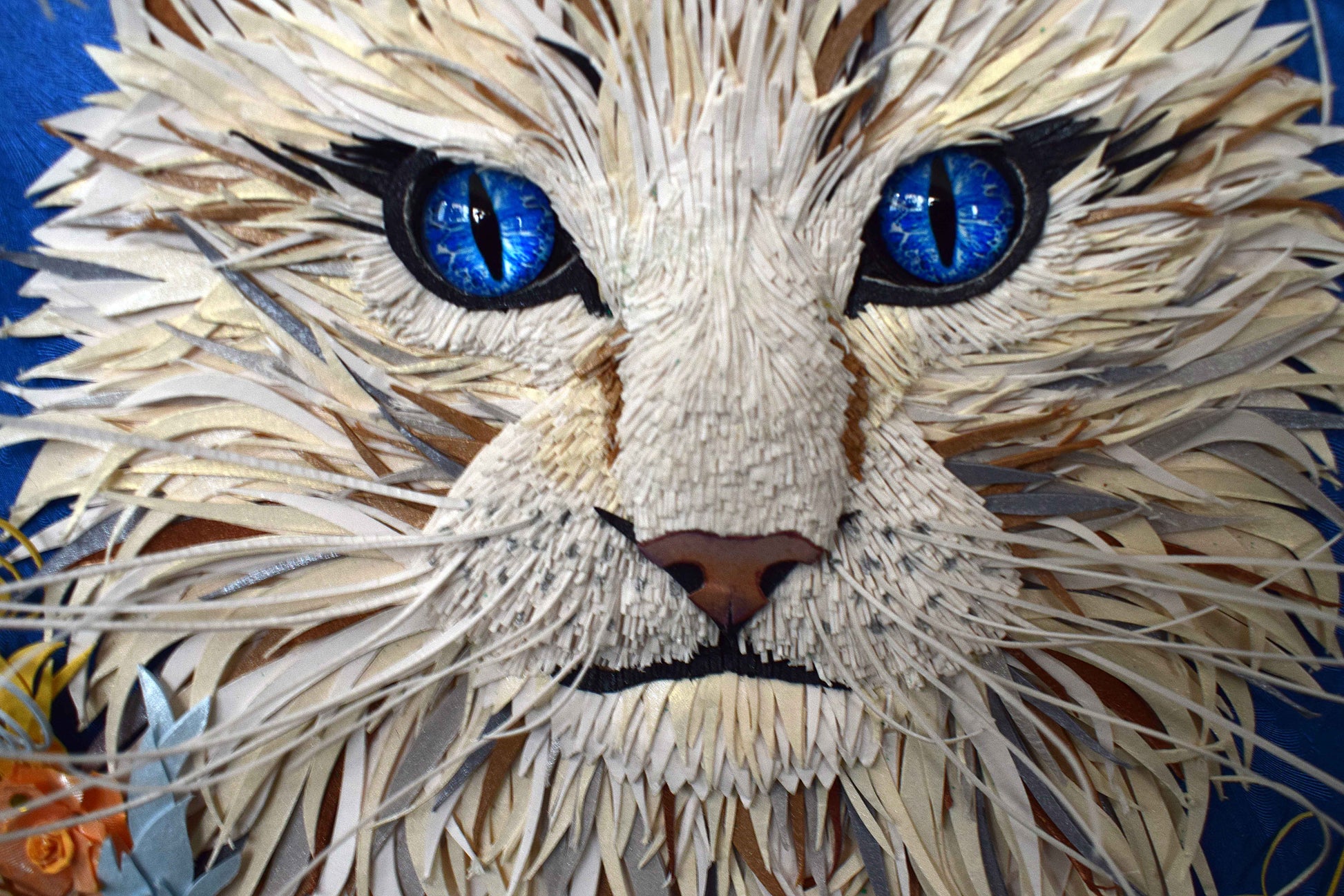 Cadre sculpture 3D en papier d'un magnifique chat main coon réalisé manuellement dans différents chuttes de papiers tels que le blanc, noir, marron, gris, bleu, doré et créme irisés pailletés et bleu texturé.