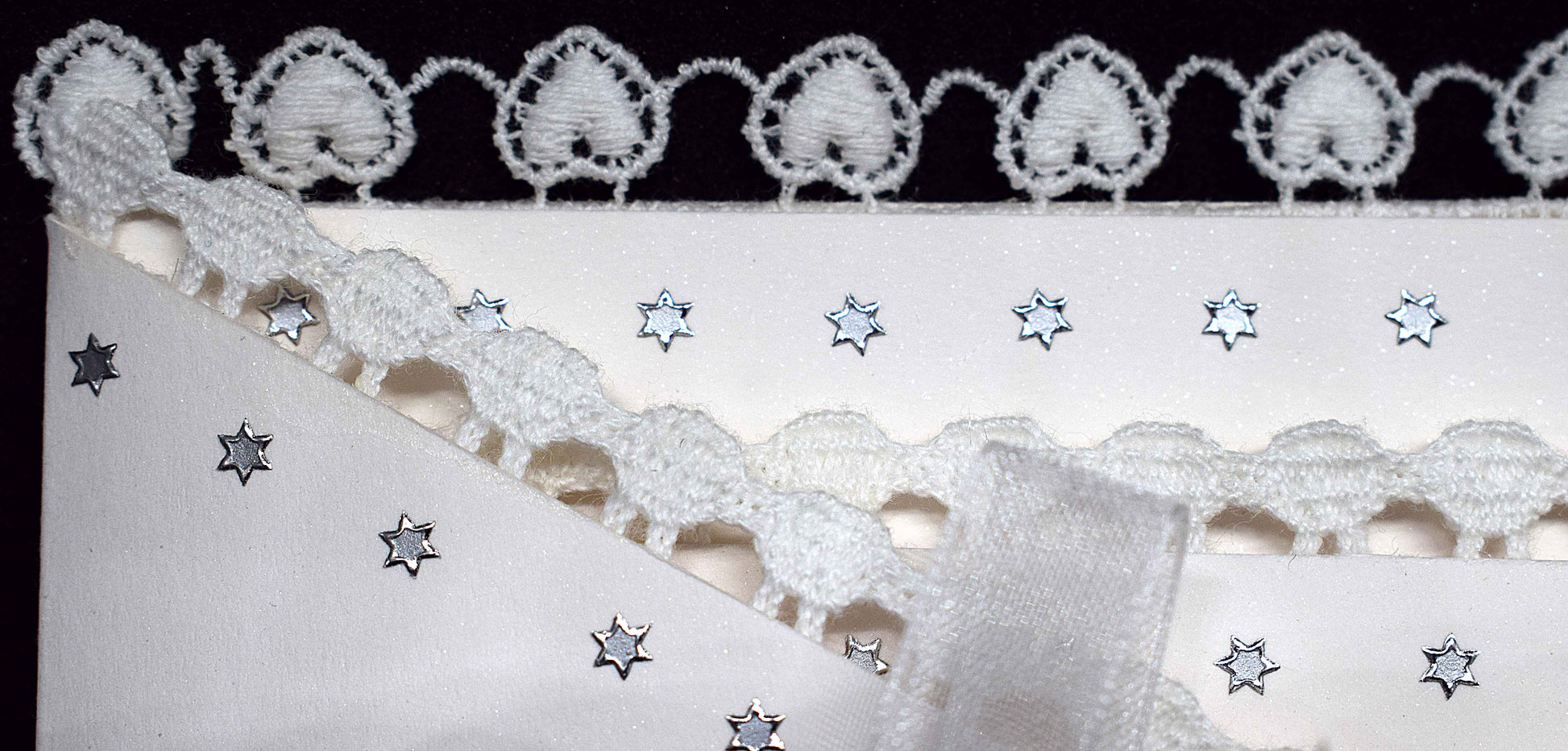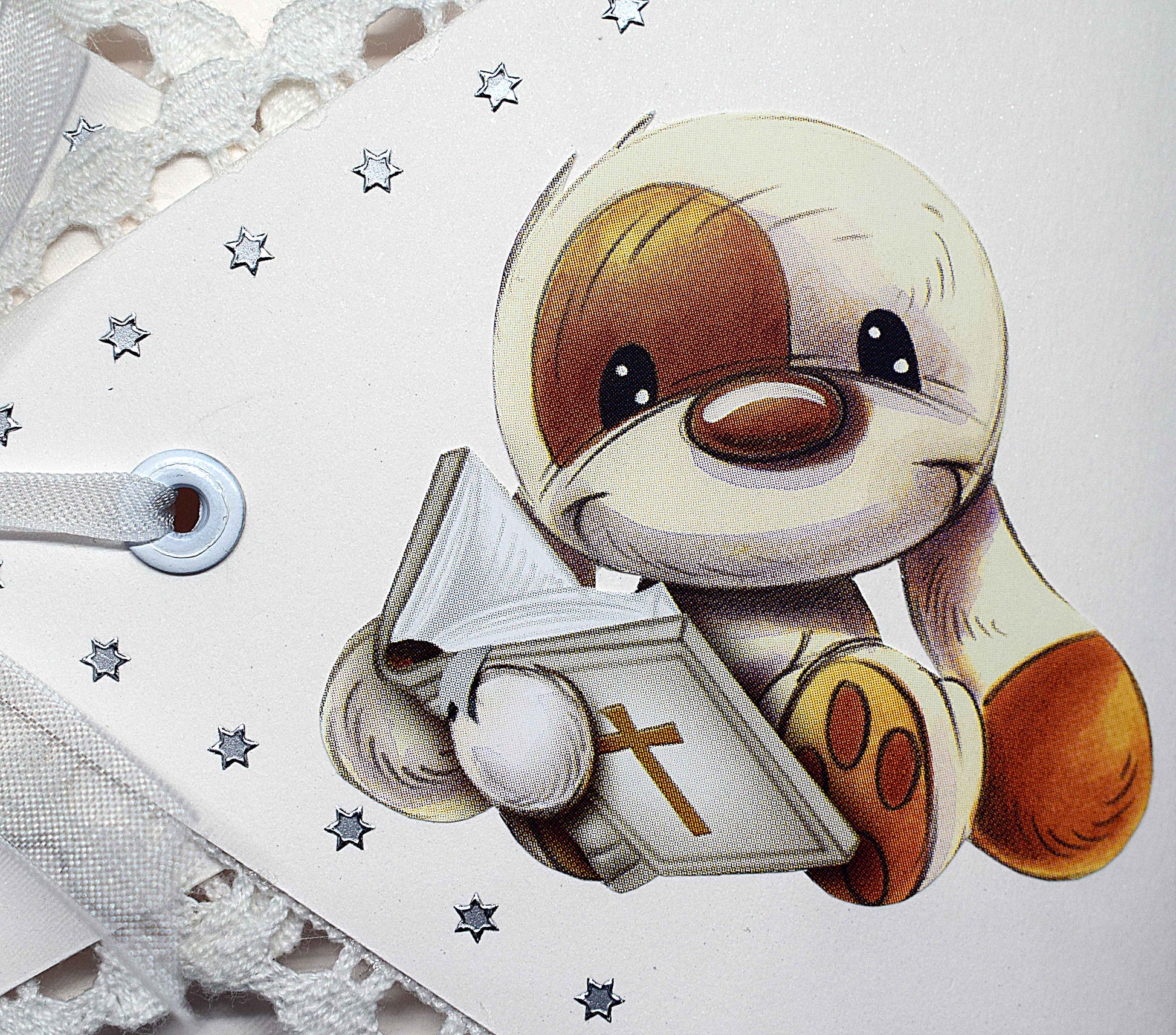 Carte en forme de lange, réalisée dans du papier blanc irisé pailleté sans acide. Tous les bords de la carte sont bordés de dentelle blanche en coton et de stickers argentés. Le ruban est en organza blanc et le motif est en 3D.