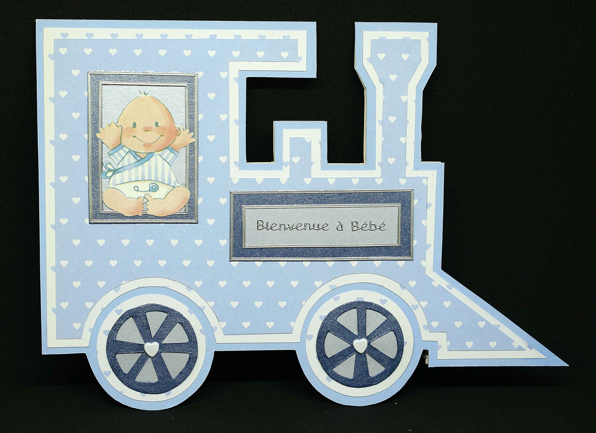 Carte de naissanceen forme de train bleu - Carte bébé 3D faite main