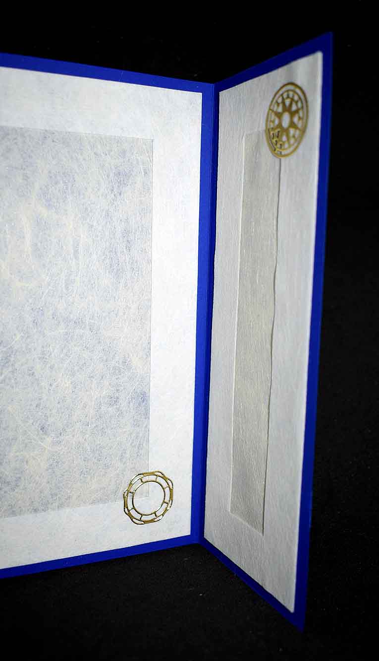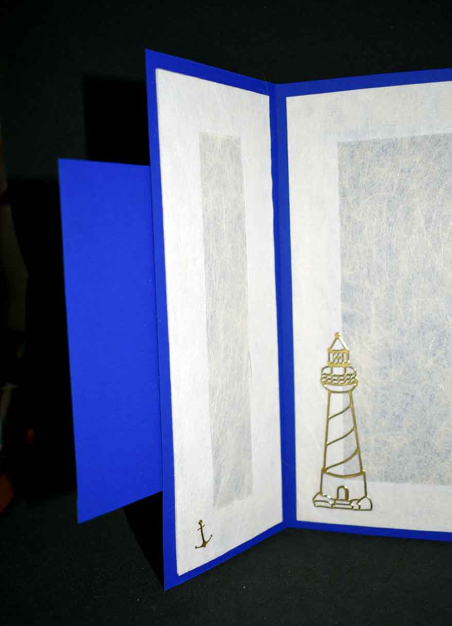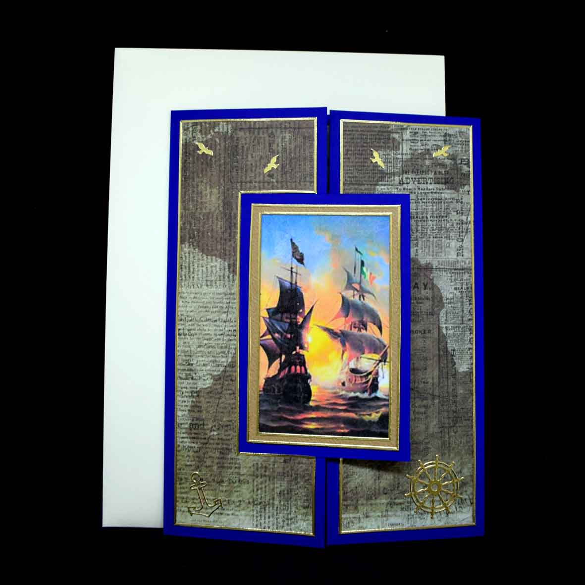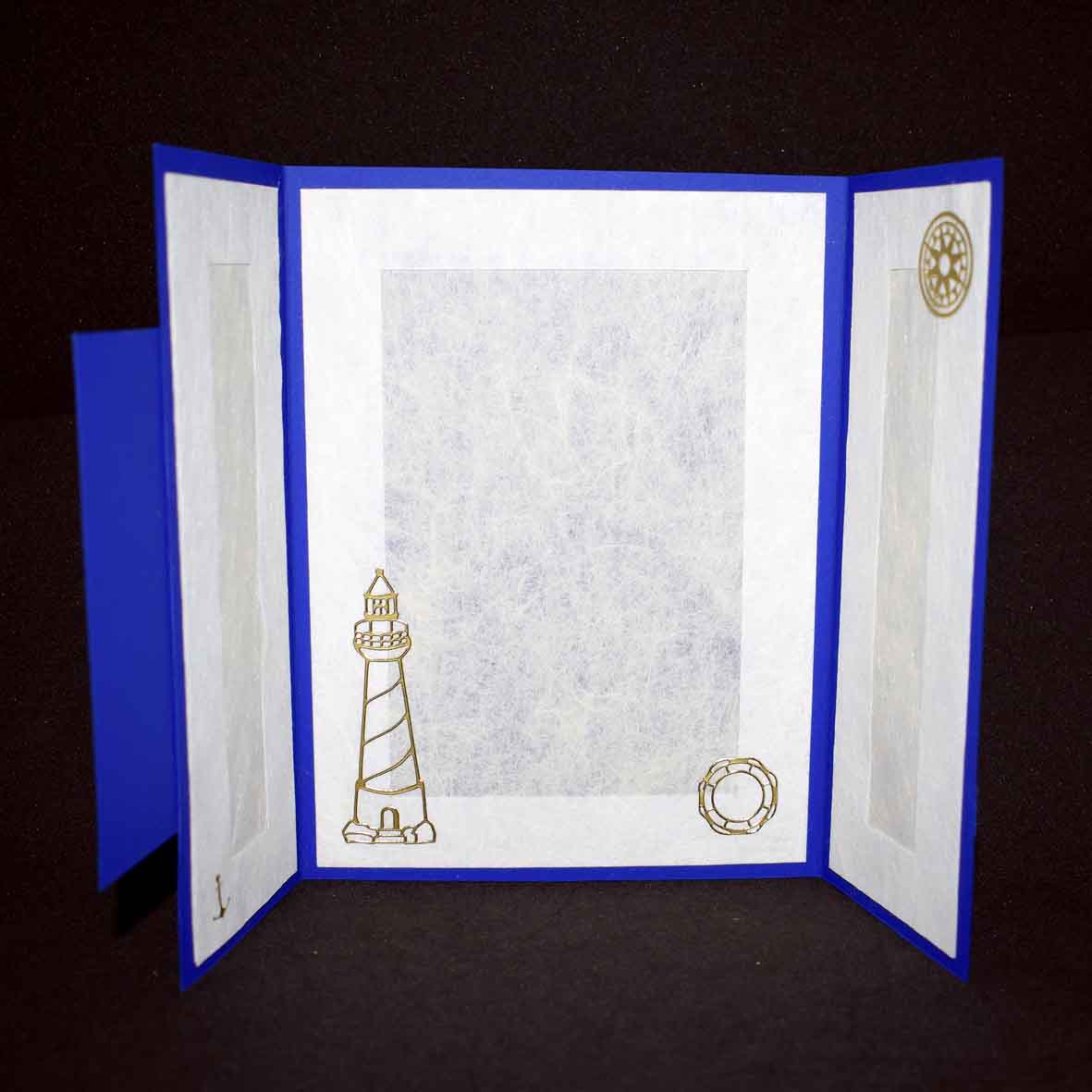 Carte marine pour diverses occasions réalisée dans du papier bleu doré texturé et imprimé marin.