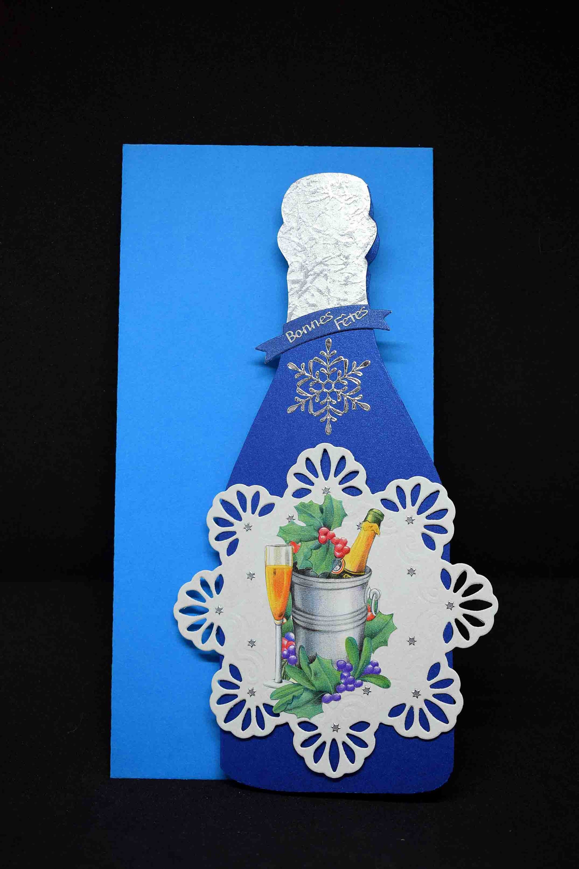 Carte de Noël en relief réalisée dans du papier bleu irisé pailleté, blanc et argenté texturé.
