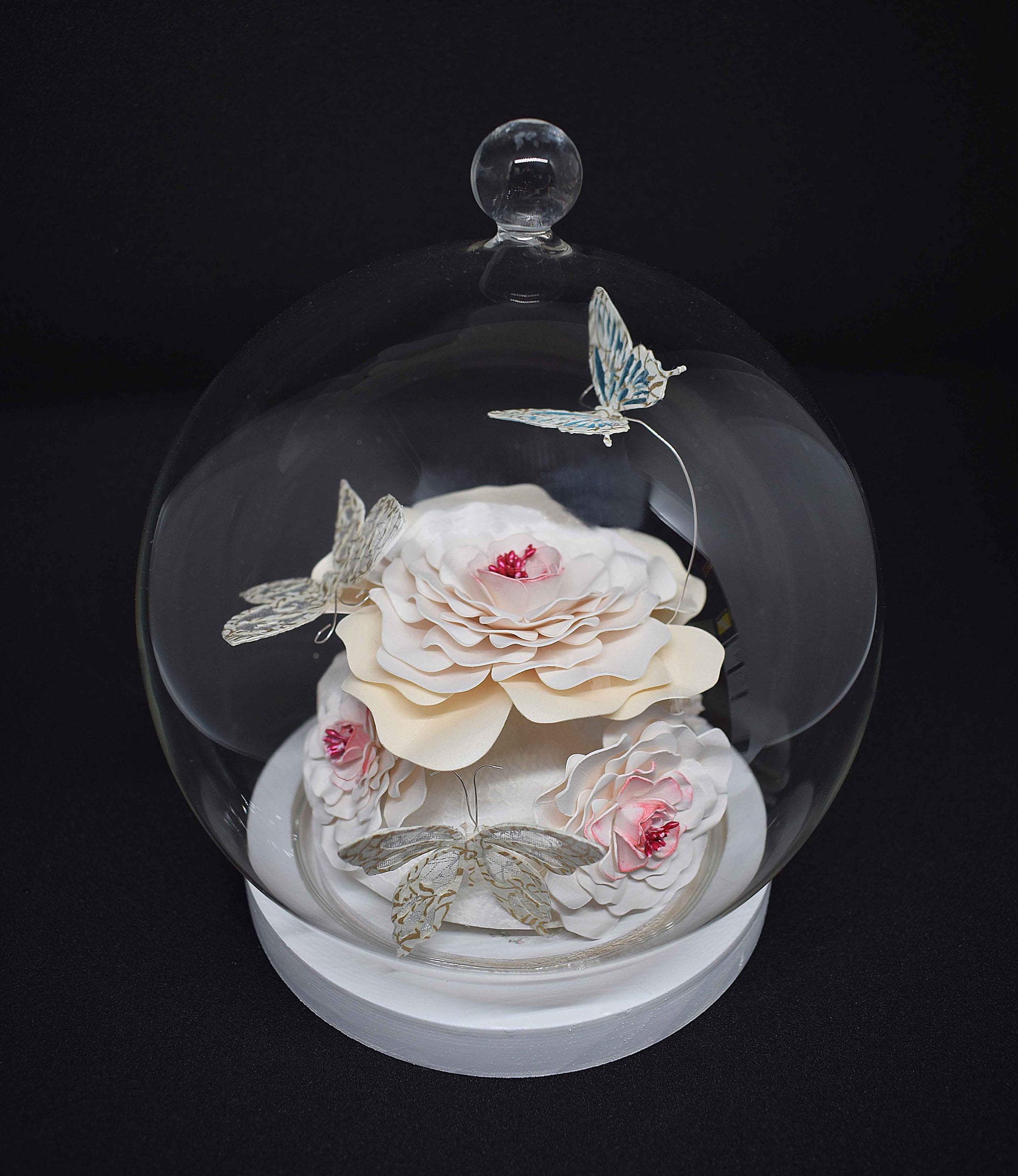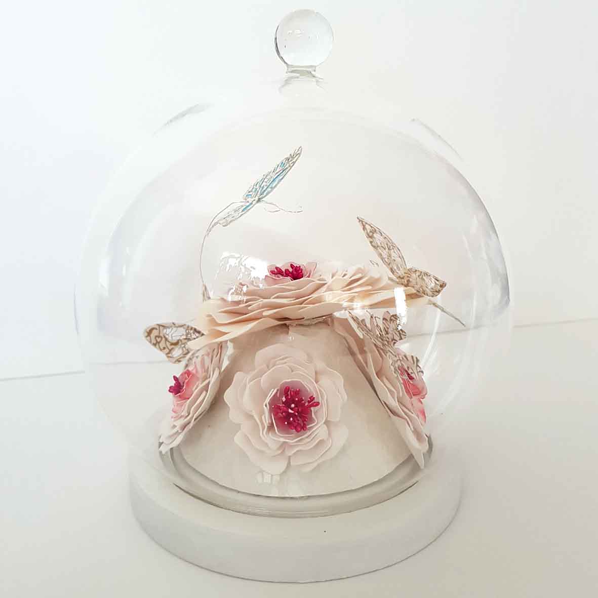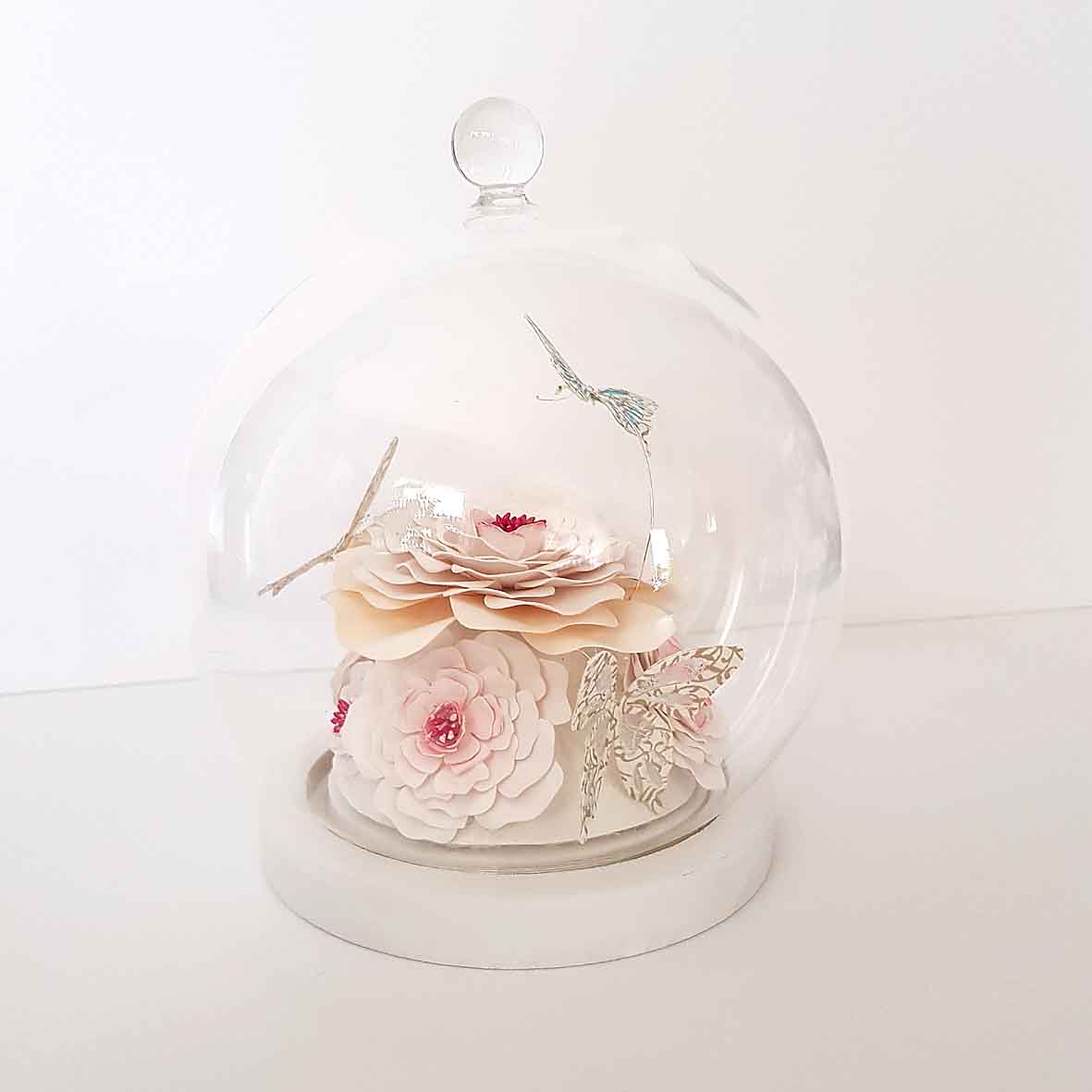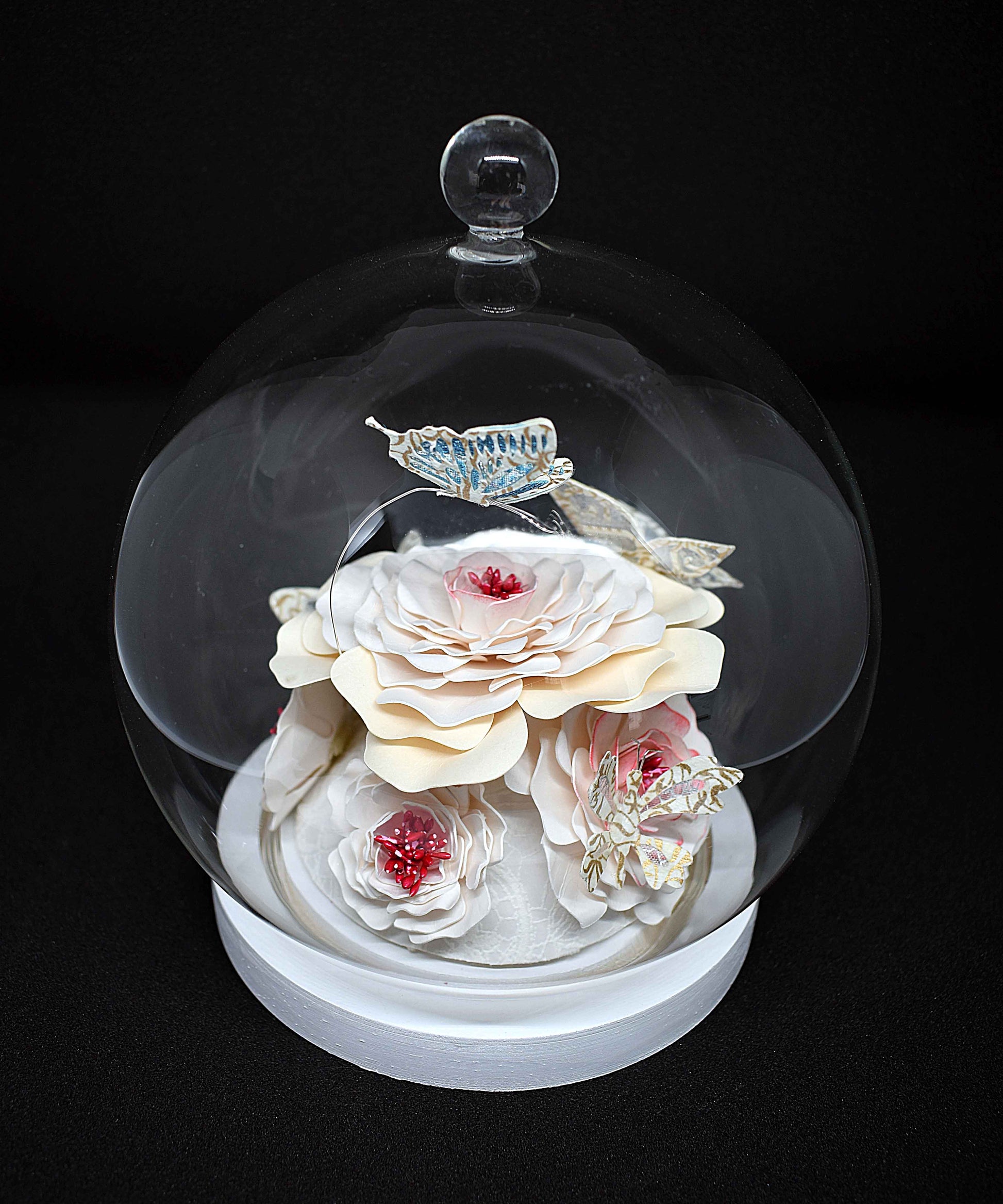 Ce globe met en valeur de délicates fleurs en papier aux teintes blanches et crème, subtilement irisées, accompagnées de papillons aux finitions élégantes.
