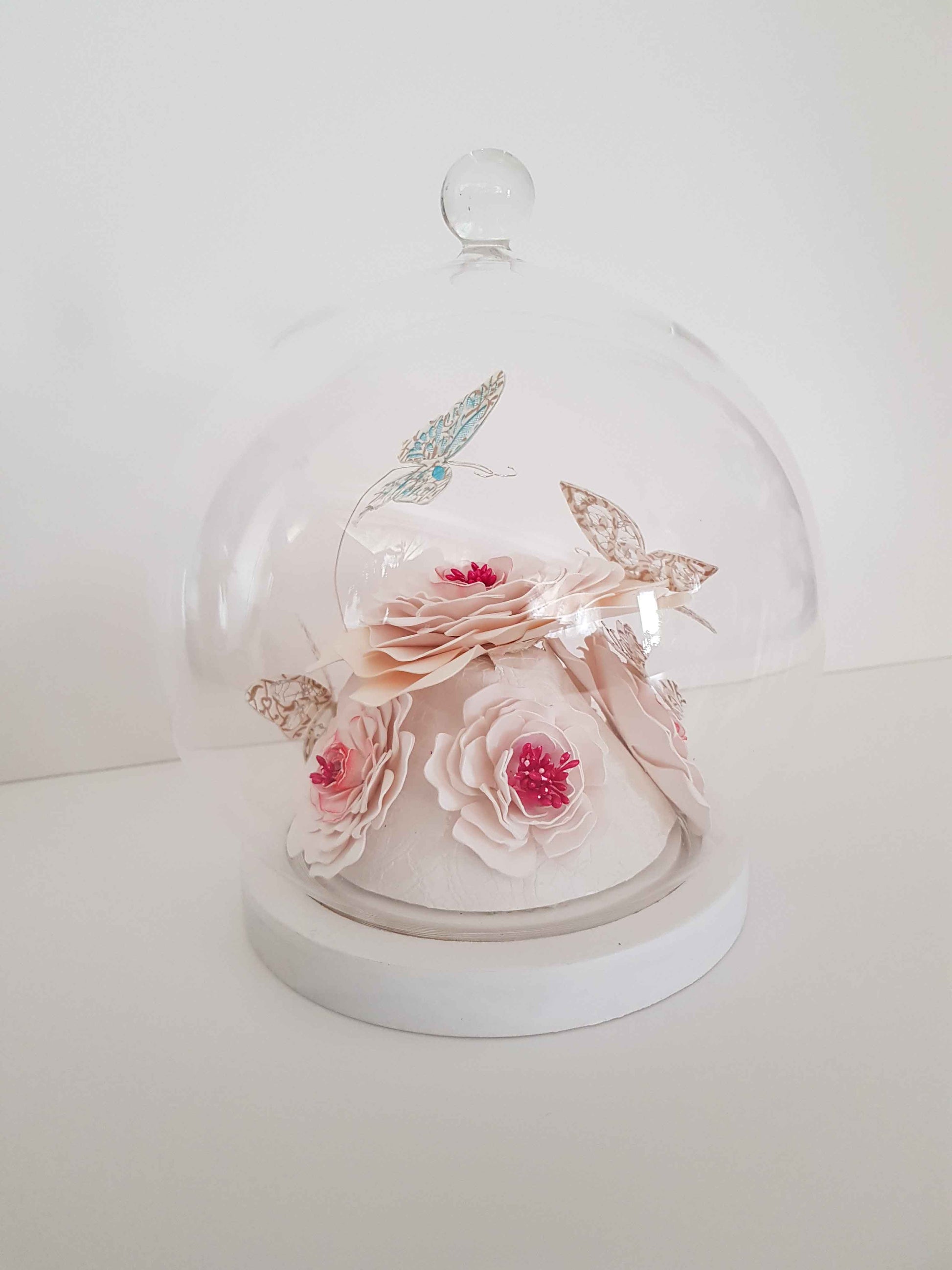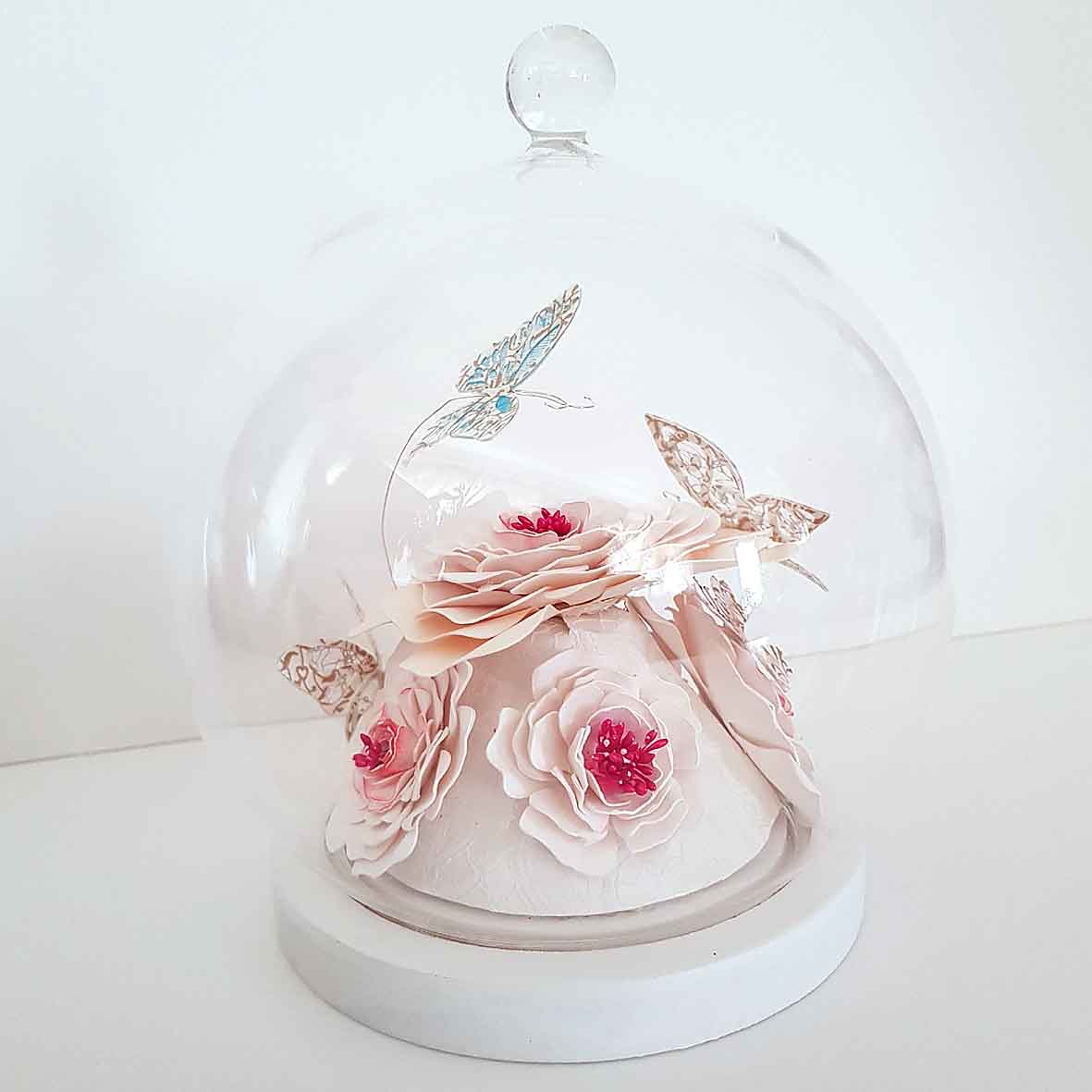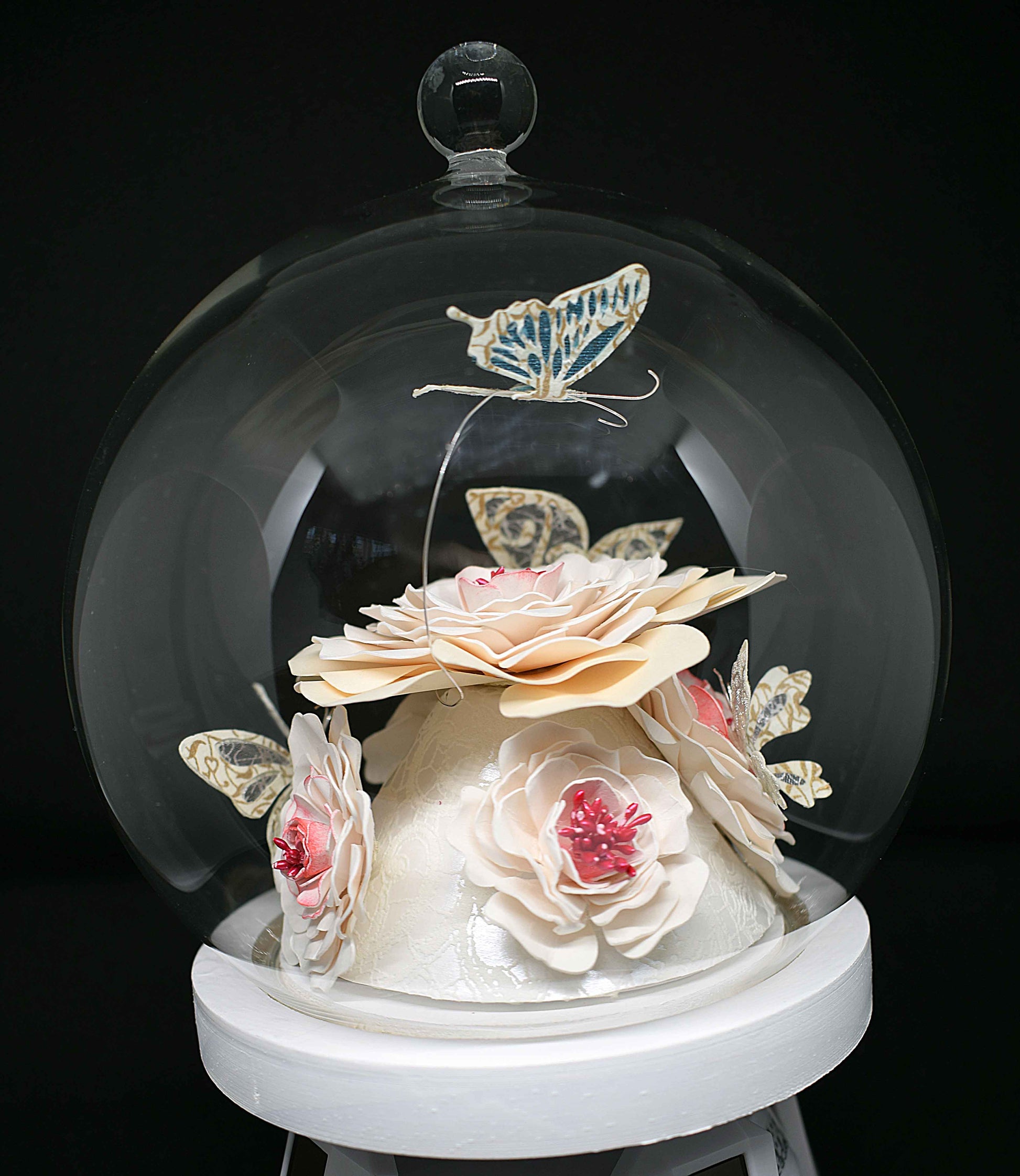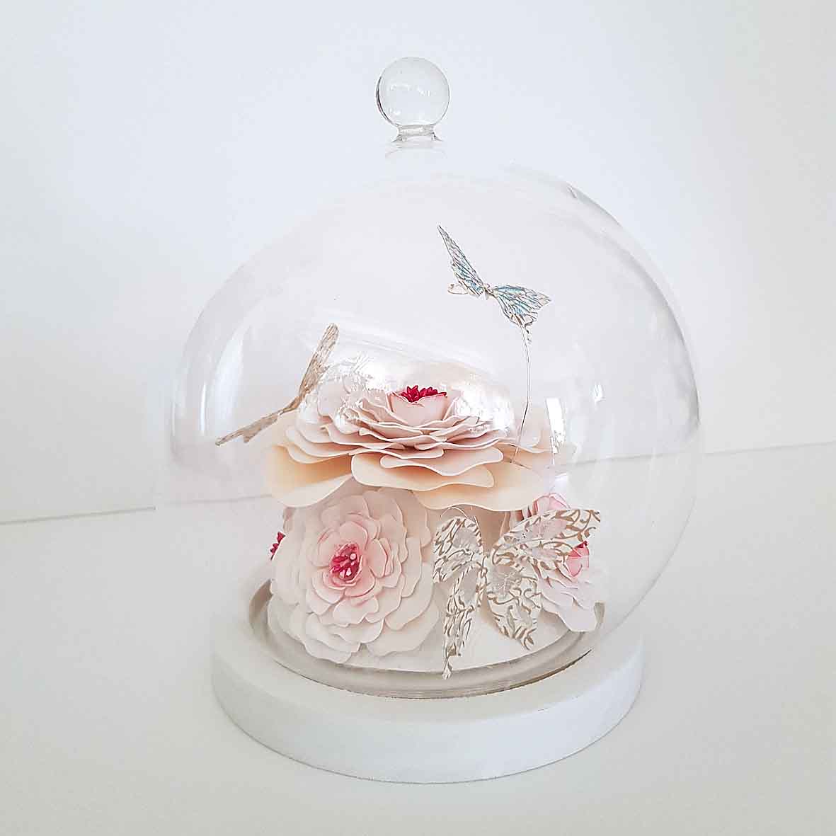 Ce globe met en valeur de délicates fleurs en papier aux teintes blanches et crème, subtilement irisées, accompagnées de papillons aux finitions élégantes.